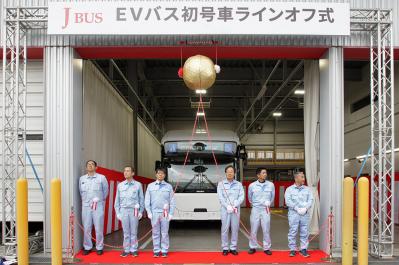いすゞ「エルガEV」BEVフルフラット路線バスの量産がスタート。ジェイ・バス宇都宮工場でラインオフセレモニーを開催